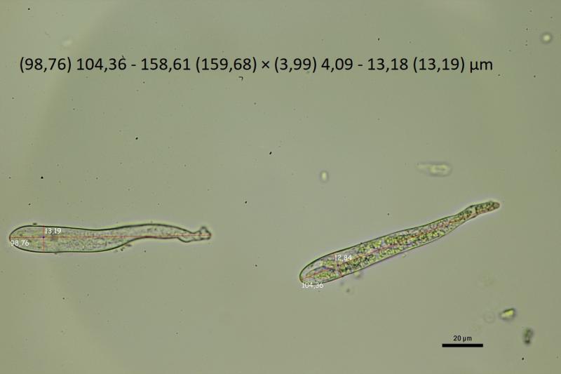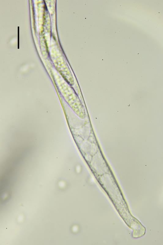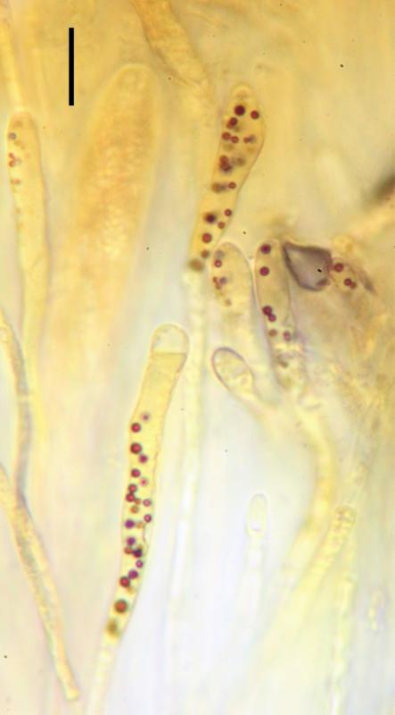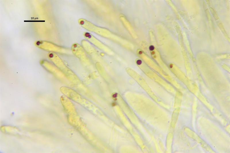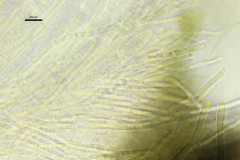 Paráfisis progresivamente ensanchándose hacia el ápice, hasta 6,20 µm, a veces bifurcadas en lo alto, septadas, con grandes VBS en todo su recorrido, en IKI las vacuolas reacciona a color turquesa, esta reacción desaparece rápidamente.