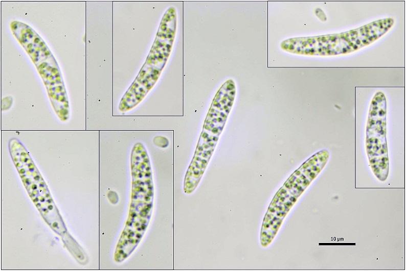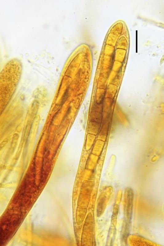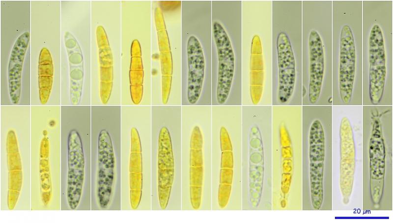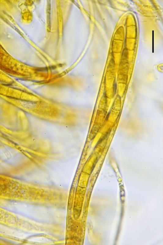 Ascosporas mas o menos fusiforme, hialinas, en ocasiones ligueramente curvadas, multigutuladas, con tres septos, algunas con pequeños conidios en los extremos.