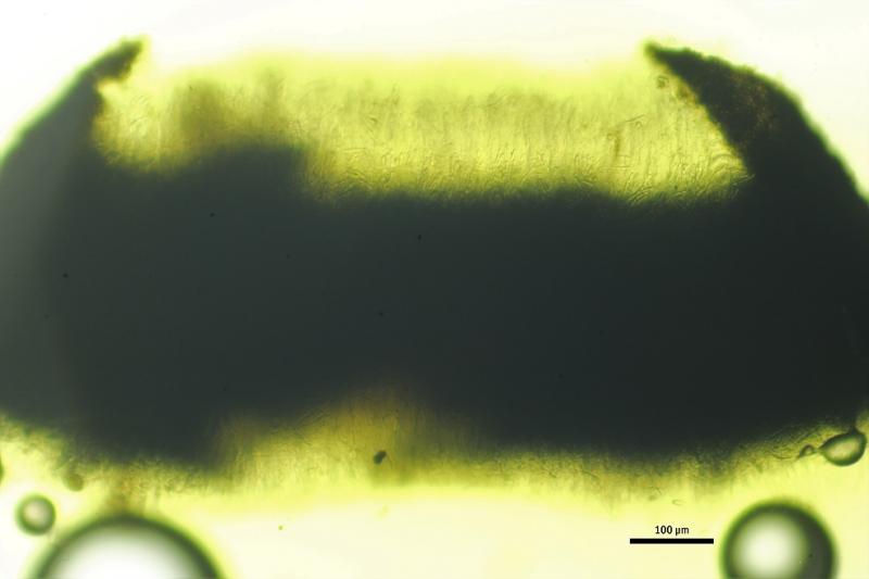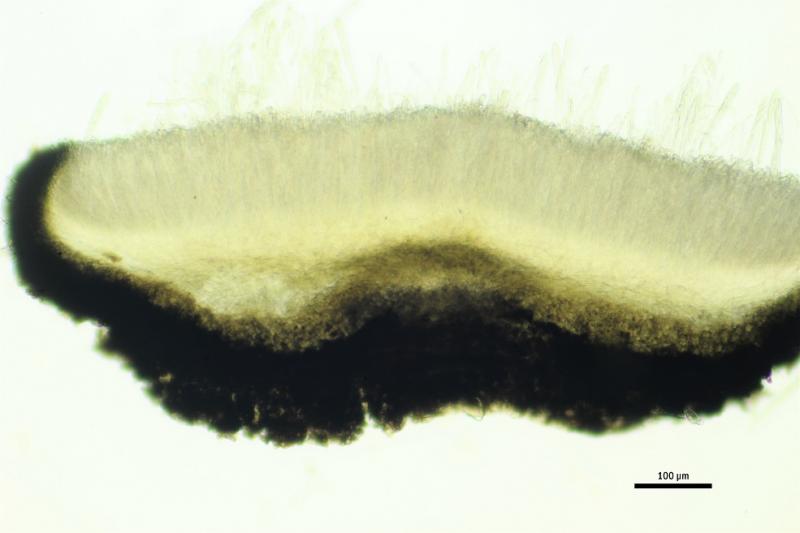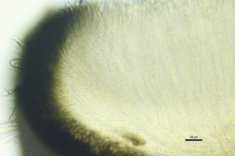 Excípulo medular con largas células de textura intrincada, pigmentadas de amarillo.