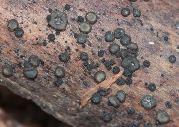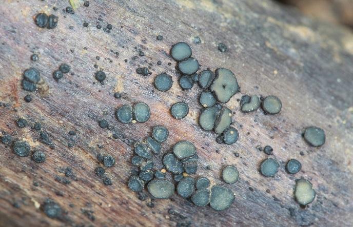 Apotecio de hasta 2,5mm, discoidales, sésiles, himenio de color verde azulado, con el margen bien definido, parte externa concolor.