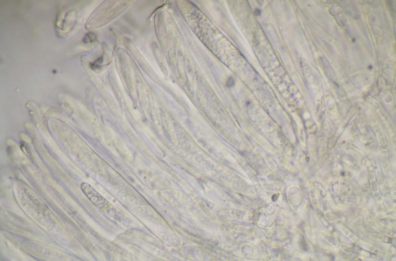 Asques : 52-66 x 6-9 µm, cylindracés, atténués à la base, à sommet ogival avec un appareil apical amyloïde de type ''calycina'', avec crochet, contenant huit spores unisériées ou bisériées.