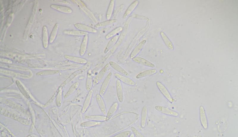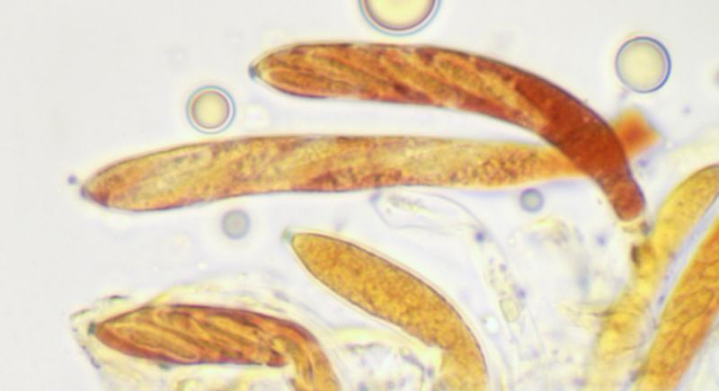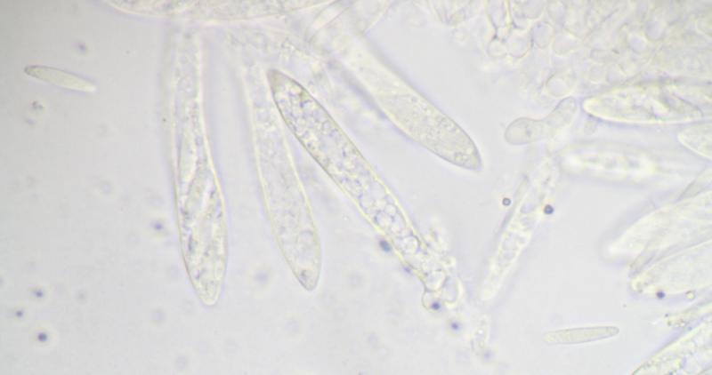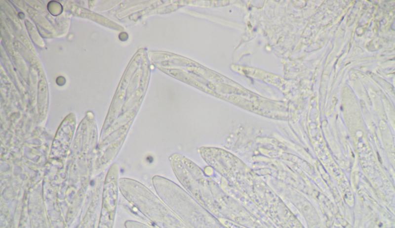 Ascospores : 9,8-13,2 x 2-3 µm (m : 11,5-2,6 µm ; Q : 3,4-4,3-5,4) elliptico-cylindriques à clavées, hyalines, avec des amas de granulations à chaque pôle, lisses.