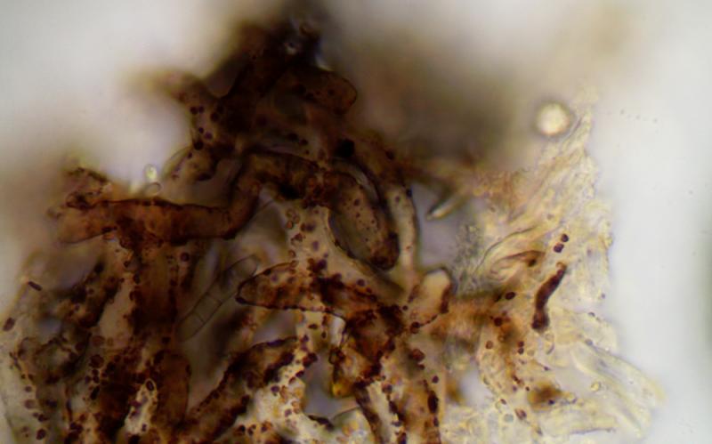 Présence à la base de quelques hyphes bruns d'ancrage, bruns, larges de 4-5 µm, septés, à paroi épaissie (1-1,5 µm).
