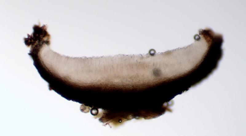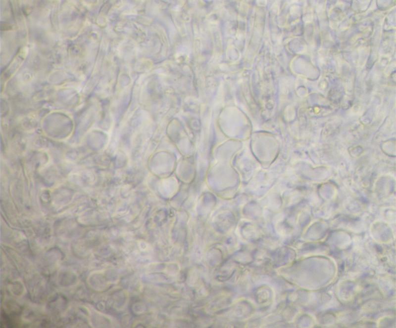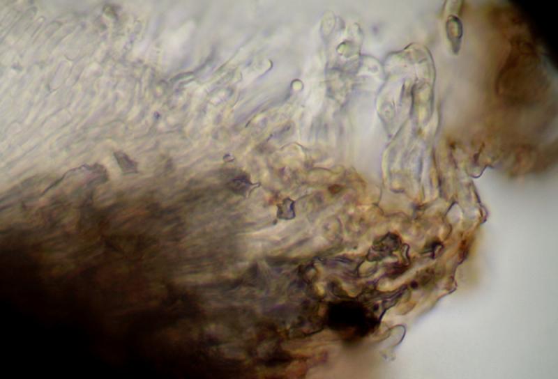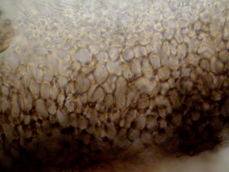Excipulum ectal de textura angularis, épais de 70-80 µm, avec des cellules brunes au bord (12-16 µm de large) et hyalines vers l'intérieur. A la marge, il y a des poils courts, flexueux, bruns, couverts de granulations brun foncé, à sommet presque hyalin (35-45 x 4-5,5 µm).