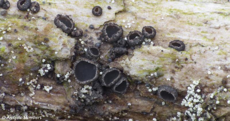 Apothécies de 0,5-2 mm de diamètre, grégaires, érumpantes, sessiles, globuleuses puis urcéolées, cupuliformes avec la marge longtemps relevée, s'aplanissant seulement tout à la fin. Hyménium gris perle, gris sombre à gris noirâtre. Surface externe brun-gris sombre, fimbriée, et plus pâle, blanchâtre à la marge qui est déchirée, souvent d'aspect côtelé (avec des franges plus sombres).