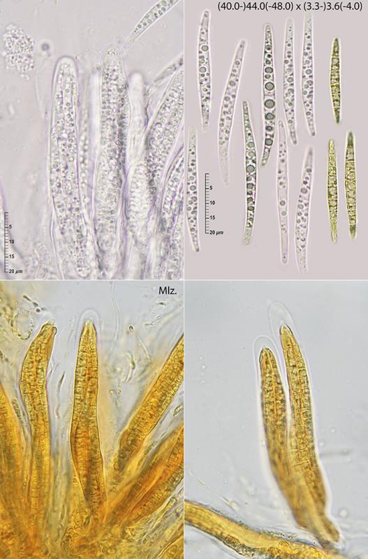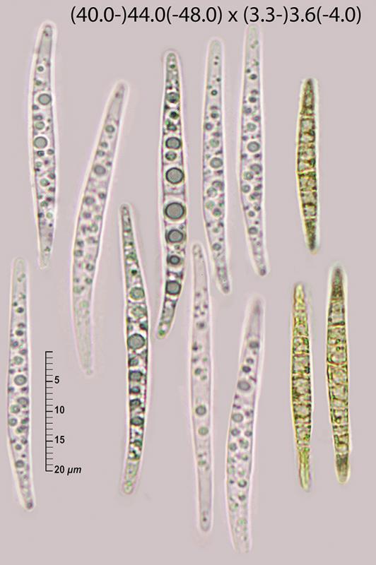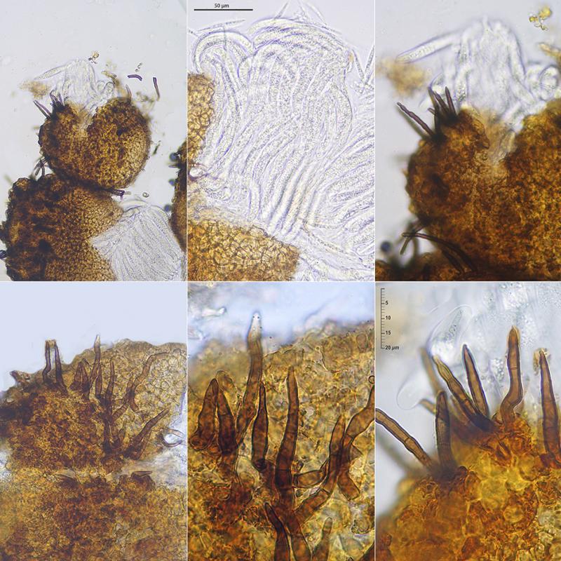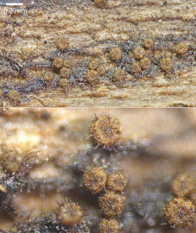 These superficial globulose or barrel-shaped, luteous, minute up to 0.2 microns) pseudothecia sometimes with groups of periostiolar brownish, short septate setae, grew on decorticaed wood of Fagus sylvatica mixed with perhaps related ascomata of Chaetosphaeria ovoidea.