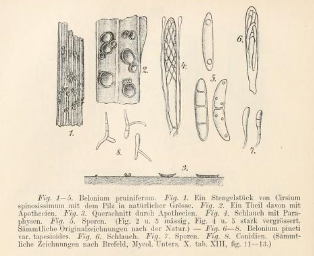 But did you see that Rehm (copied from Brefeld) shows Belonium pineti var. tapesioides, with spores with a tapered base?