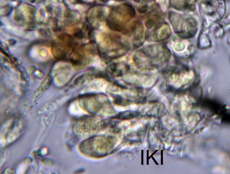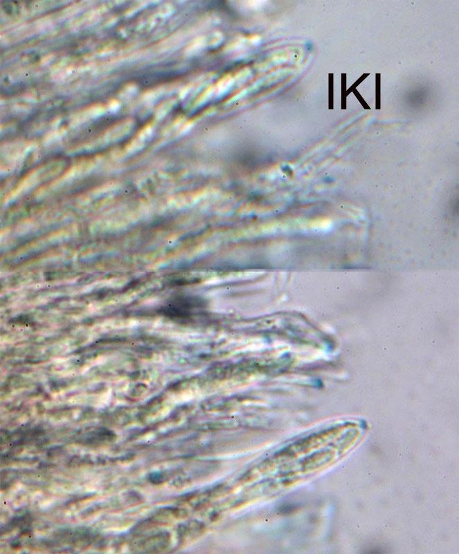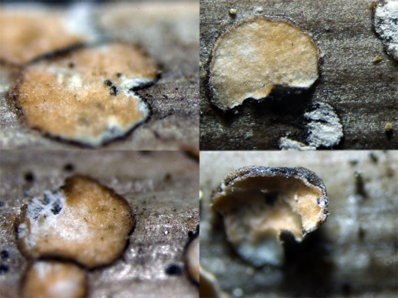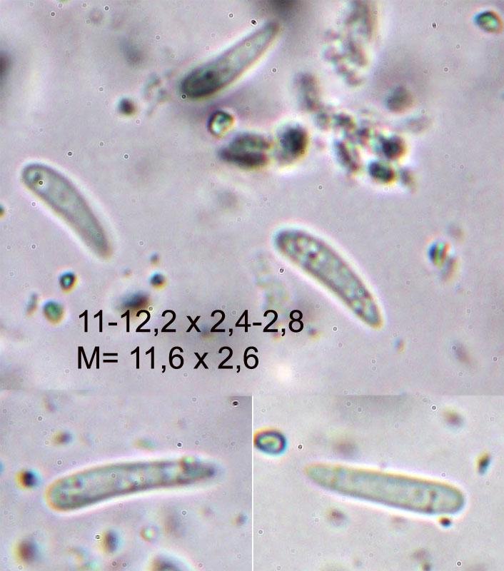 I suppose Mollisia hydrophila, the spores would fit. In this case the medulla should contain a lot of crystals. Some collectiosn reacted yellow with KOH, others not.