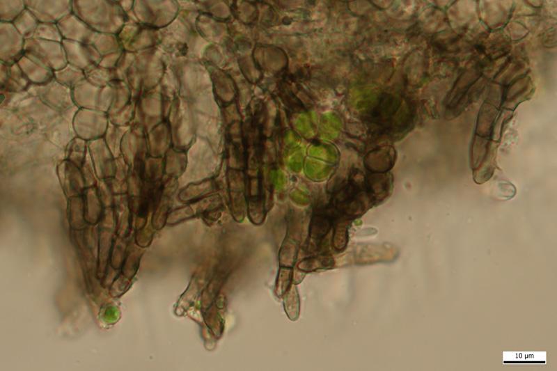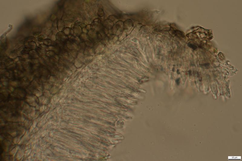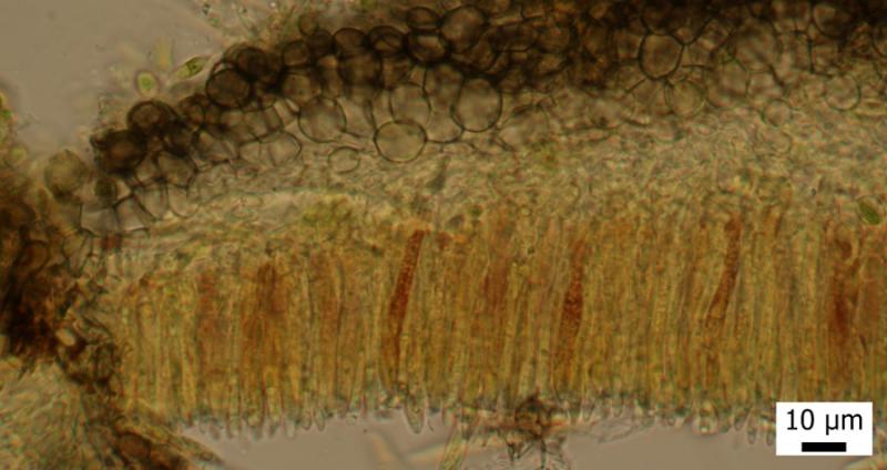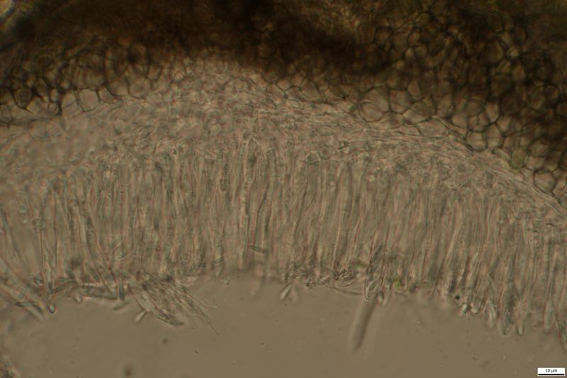 Ectal excipulum up to 40 µm thick at flanks, formed by textura globulosa-angularis, cells 5-14 x 5-11 µm, having dark walls.