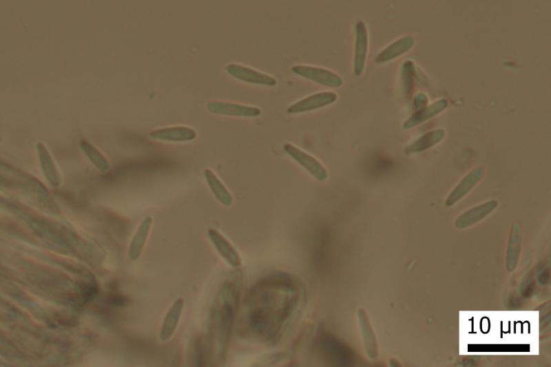 Ascospores hyaline, aseptate, smooth, without LBs, (6.9) 7.3-8.8 (9.5) x (1.6) 1.7-2.2 (2.3) µm, average 8.2x2 µm, Q=(3.3) 3.6-4.9 (5.4), Qm = 4.2, with a sheath on one pole.