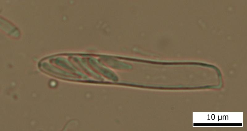 Asci 36-48 x 5.1-6.3 µm, 8-spored, IKI bb, croziers +, ascospores arranged in 2 rows.