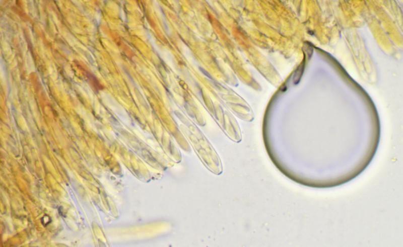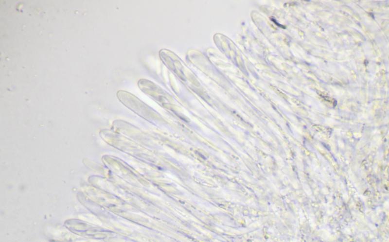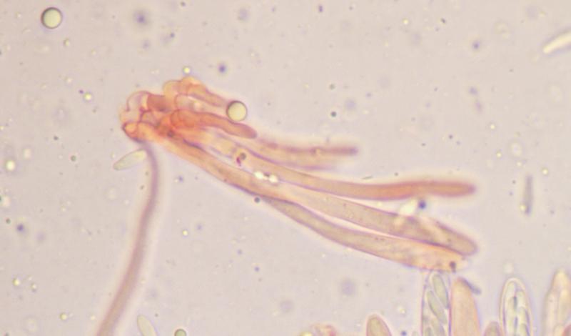 Asques : 40-55 x 3-3,5 µm, cylindriques, avec crochet, à appareil apical amyloïde de type Calycina, contenant huit spores bisériées.