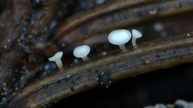Apothécies jusqu'à 1 mm de diamètre, cupuliformes, stipitées. Hyménium blanc. Stipe jusqu'à 1,5 µm, concolore mais très finement poilu.
