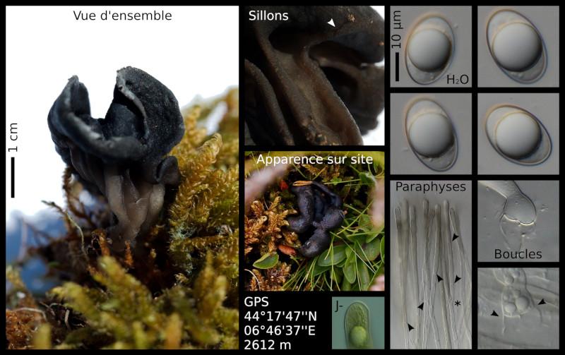 Apothécies < 5 cm, stipitées, noires, en forme de coupe irrégulière ou pourvues de deux lobes, enfouies dans une épaisse mousse. Hyménium noir. Stipe court (3 cm) grisâtre, s'éclaircissant à la base (où il est alors blanchâtre), parcouru de sillons dont les arêtes se prolongent légèrement dans la partie supérieure. Surface externe d'aspect légèrement granuleux ou furfuracé.