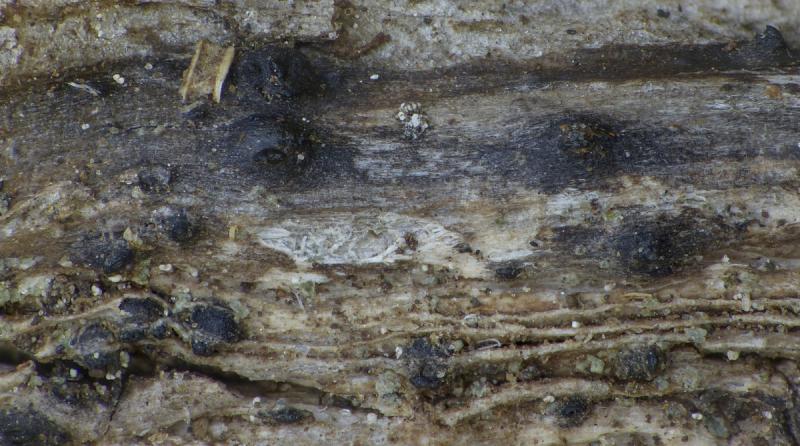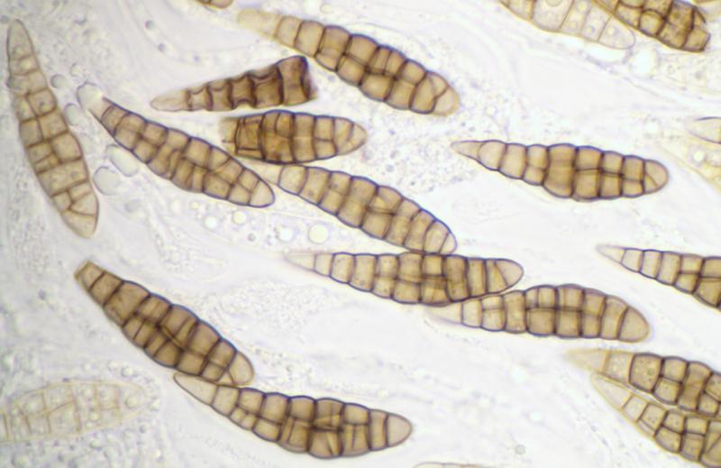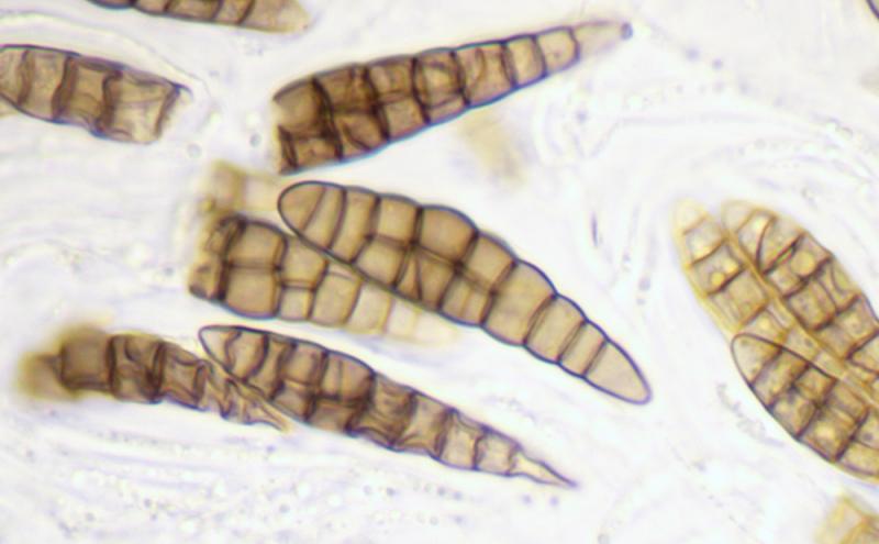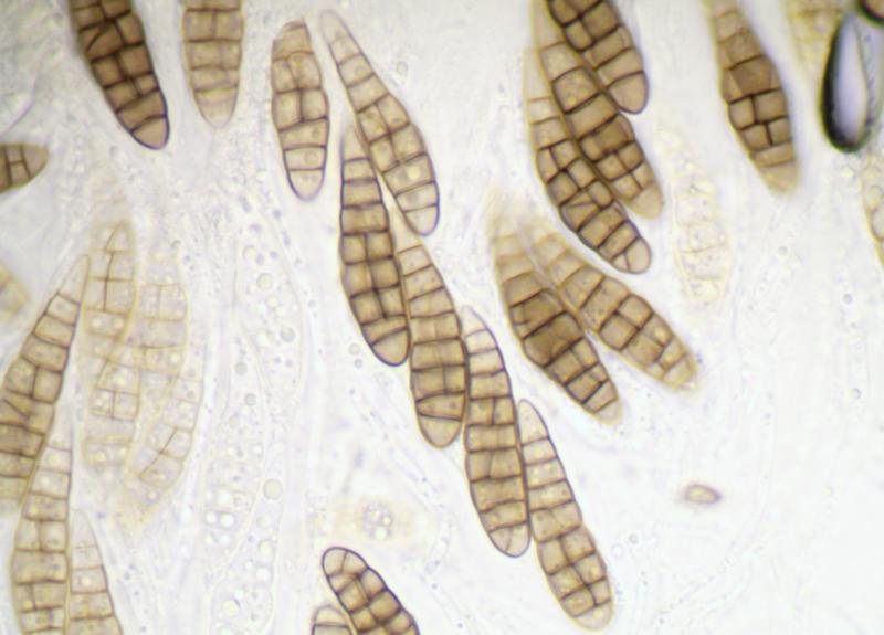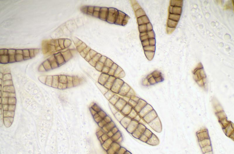 Ascospores : 30-42 x 7-10 µm, fusiformes, avec 8-10 cloisons longitudinales et plusieurs cloisons transversales, brunes.