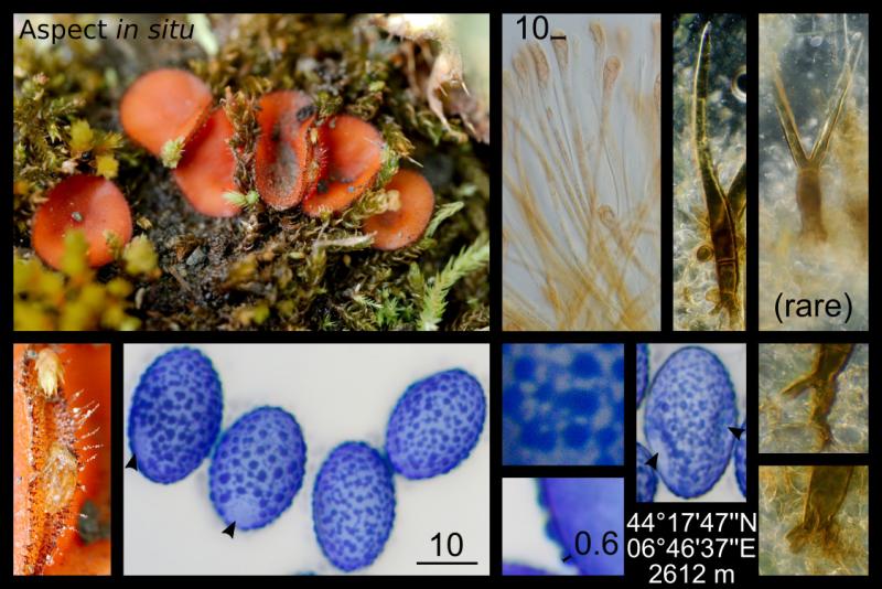 Apothécies nombreuses, fines en épaisseur, rouge orangé clair, < 1 cm, cupulées, étalées ou comprimées, à poils dressés, bruns, courts ou moyens.