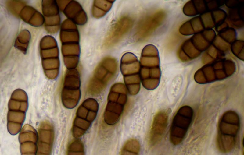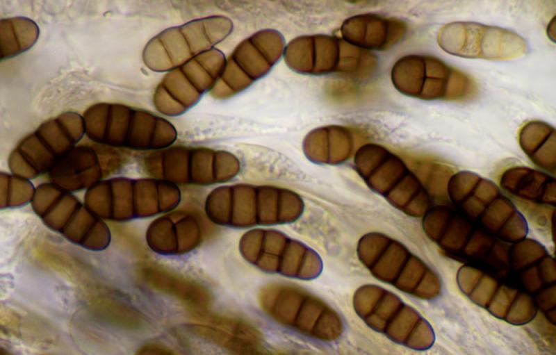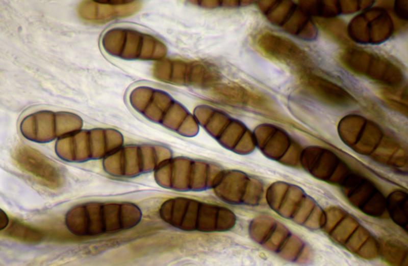 Ascospores : 15,5-18,5 x 6-7,5 µm, triseptées, parfois avec des cloisons longitudinales, brunes.