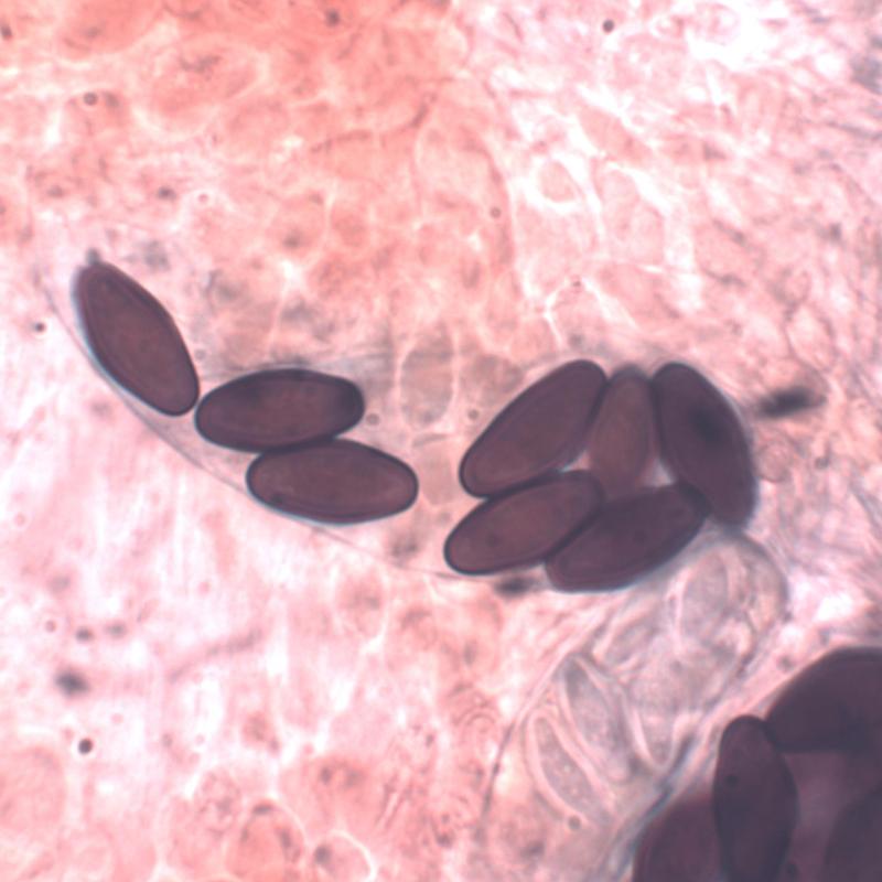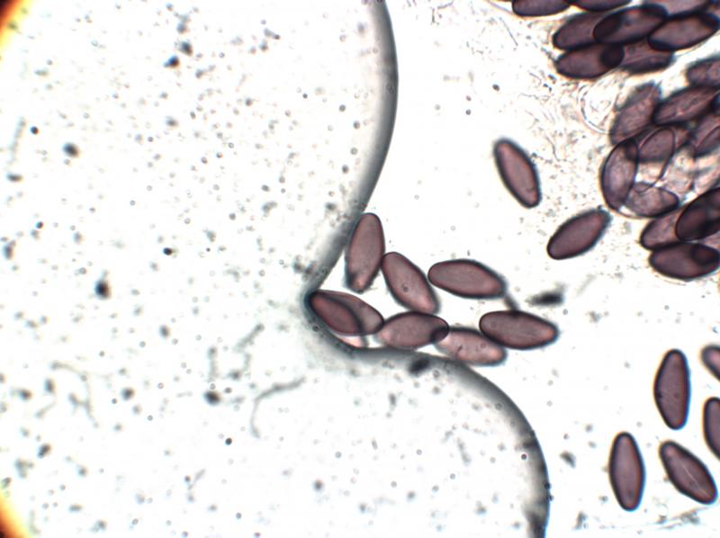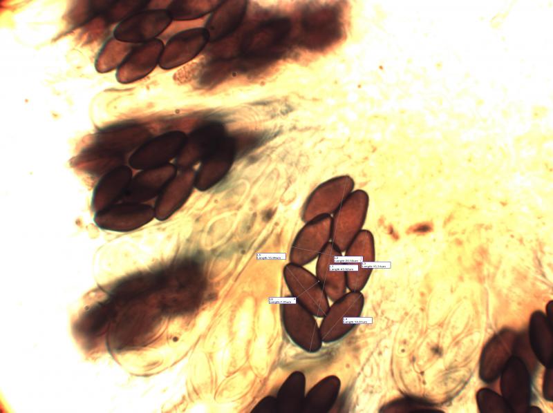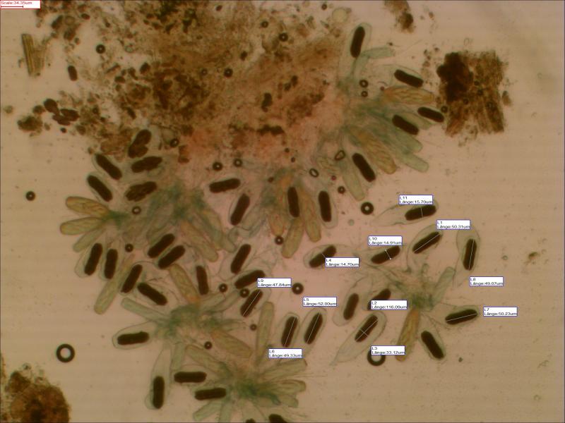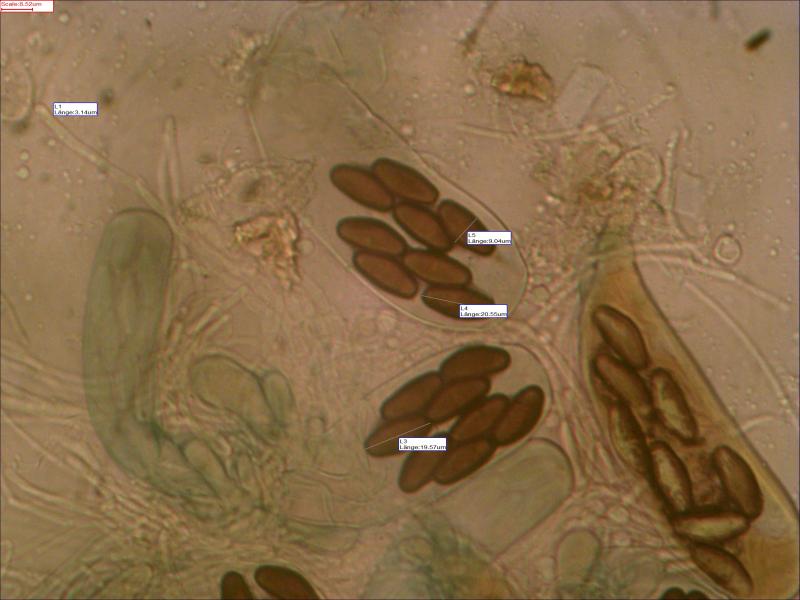 Found on deer dung a small .33mm yellow apothecia. The spore packets were 43-49 x 20 and the brown spores 14.75-15.9 c 7.25 with no obvious ornamentation. Ascii deep blue in Meltzers. Although there were no ejected spores on this first sample they looked to be very loosely held together.