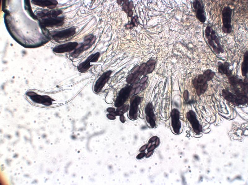 Ascus 117.9-35.3 um expanding in length before cluster release in this case to 130 um with almost the same width.