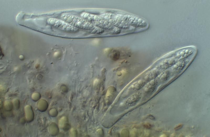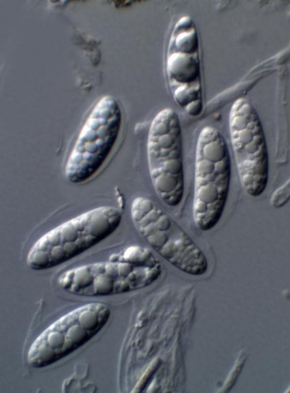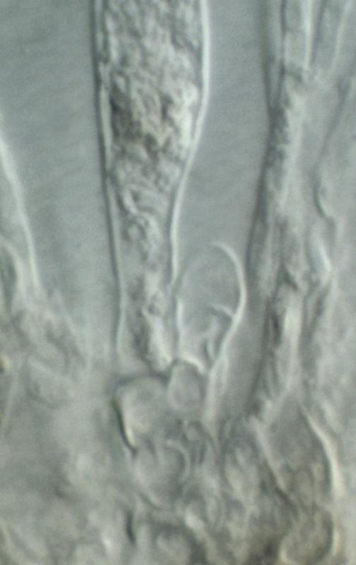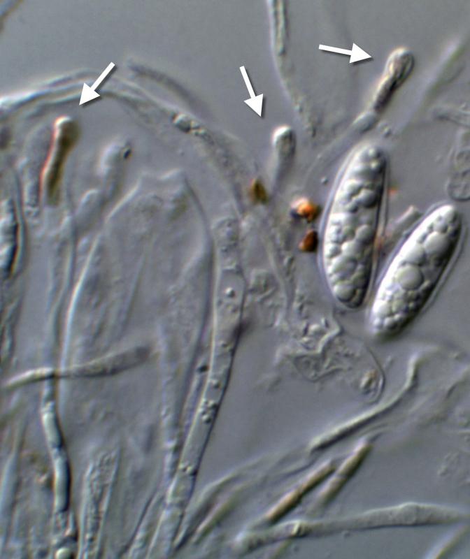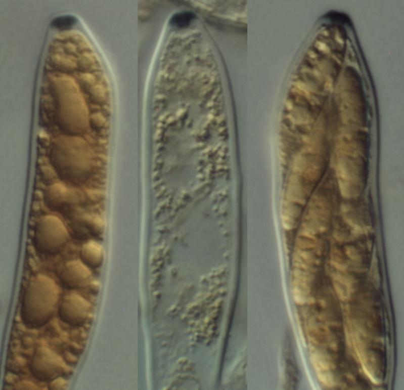 The piece of stem was kept damp in a fridge for several days and the ascomata developed somewhat. Here one can clearly see the yellow apical contents of the paraphyses, mentioned by Zotto. Also an ascus base, which I would say shows croziers? The asci show a clear space around the spores, which I think is a reflection of the spore "sheaths" shown in the original post.