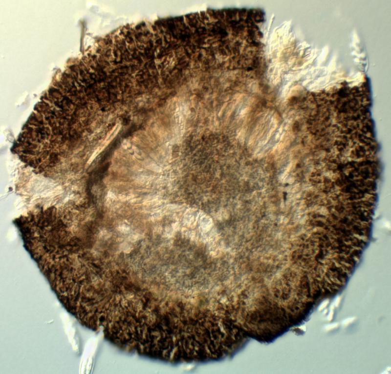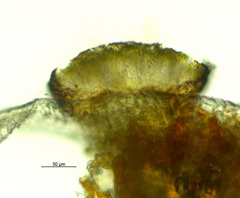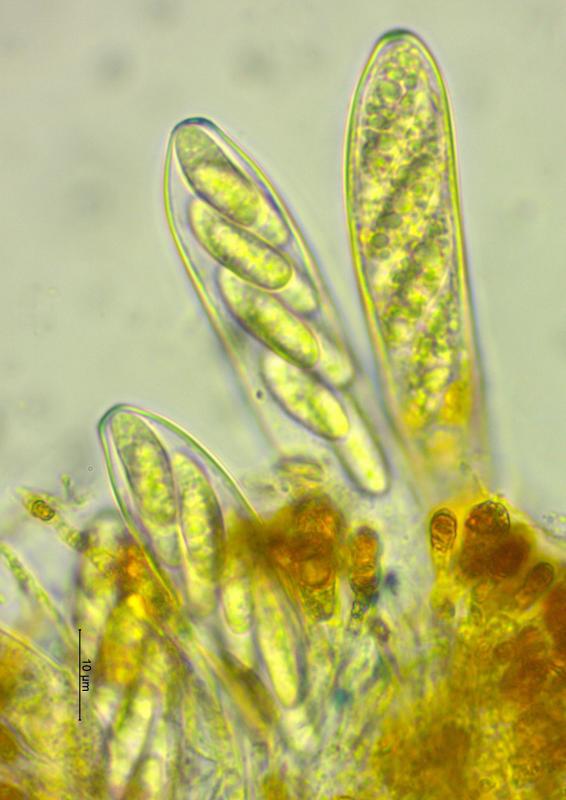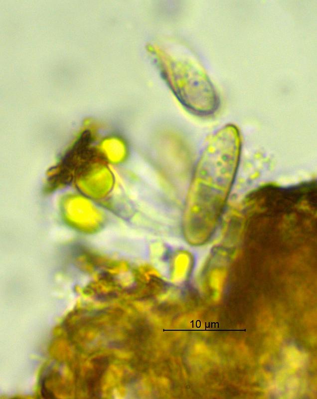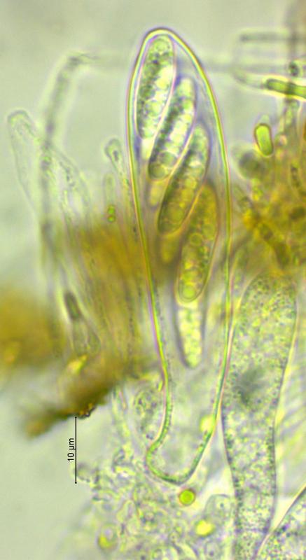 Récolte réalisé sur bois de Vaccinium myrtillus (Tourbiére à 1'017 m), apothécies 0.1 - 0.4 mm de diamètre, sessile, hyménium jaune, surface externe brun foncé, asques octosporés, 58 - 82 x 13 - 16 µm, IKI+, avec crochets, spores hyalines, lisses, multiguttulées, 15 -20 x 4 -5 µm, paraphyses élargies au sommet avec vacuoles réfringentes. Je pense avoir trouvé la même espèce que Chris a présenté dans ce forum. Merci d'avance.