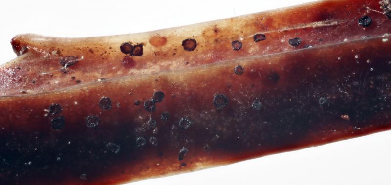HB 9378: Lapland, Saxnäs, Bjurälven, leg. Björn Norden. On standing 1-2 mm thick dead stems (upper parts) of Vaccinium myrtillus, lower parts often still alive, soc. Coccomyces leptideus & setose pyrenomycete.