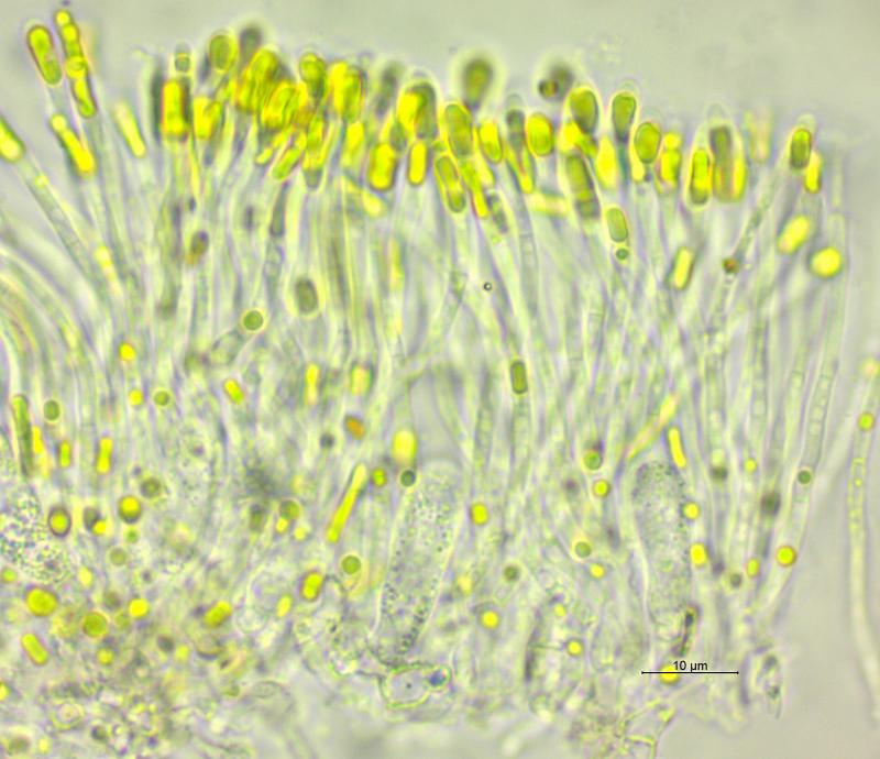 Thanks for the swift response Zotto. Yes the paraphyses do have yellow contents particularly at the apices - I'll attempt to get better pictures tomorrow, there are quite a few apothecia and as you say the fungus is in good condition / stages of development.