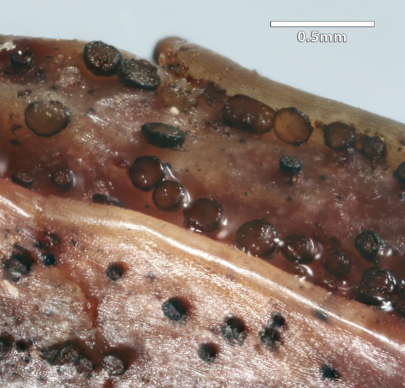 How could this species have been classified in the old literature, perhaps as a Pezicula? P. myrtillina? That has hemiamyloid apical rings, and Orbilia boydii is a synonym. Eupropolella vaccinii is erumpent and has brown 1-3-septate spores. And Pseudophacidium ledi has eguttulate spores and is also erumpent.