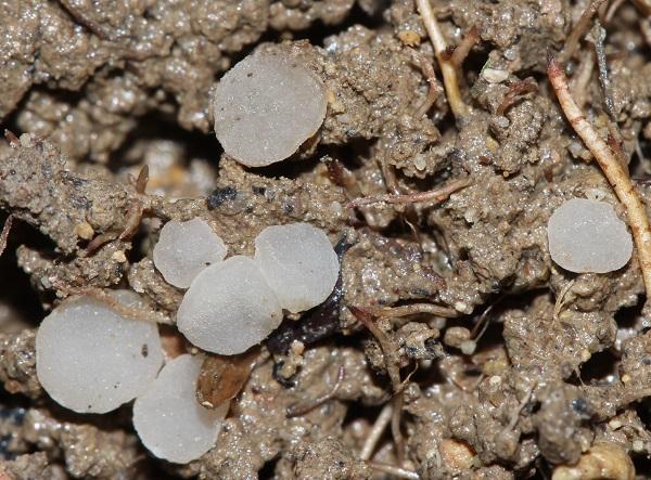 Apotecios de hasta 3´5mm de diámetro, de turbinados a pulvinados, himenio al principio de color blanco brillante, después débilmente grisáceo por la maduración de las esporas, parte externa concolor con el himenio.