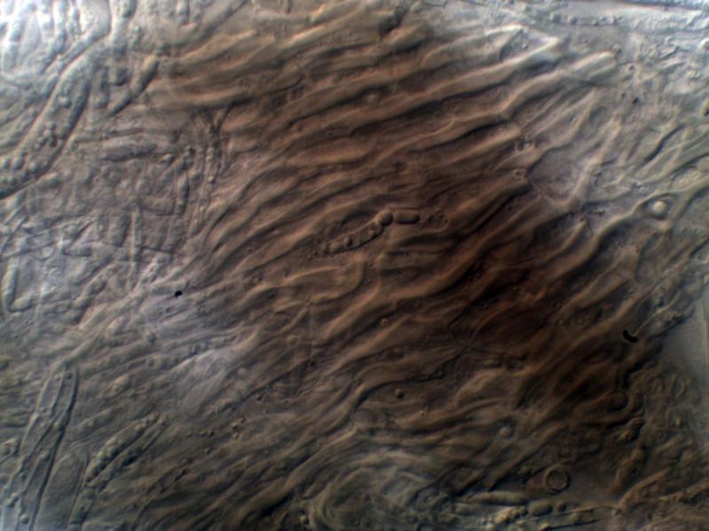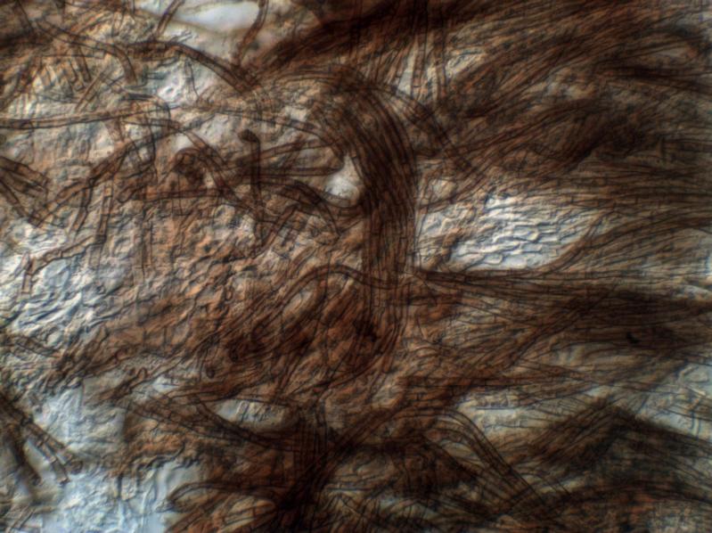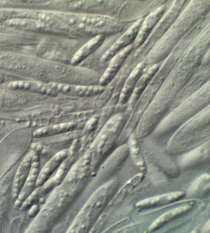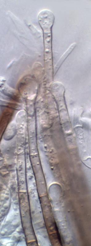 Basal hairs were, as expected undulating, outer hairs occasionally with balls of tiny crystals, asci with croziers and with apical apparatus blue in Baralsche Löhsung, spores measured 10.6-15.6(17.5)µm. However a few features puzzle me. The paraphyses are slender and totally cylindrical, blunt-tipped and with no hint of a lanceolate apex. The spores consistently contain rather large globules at each end, with a small clear central area - none show any sign of becoming septate. I trust these features can be seen in the accompanying images.