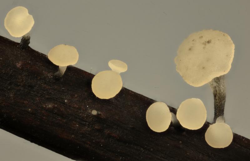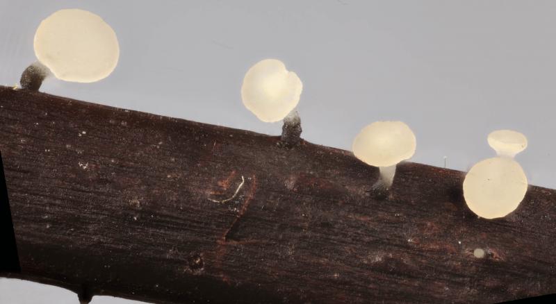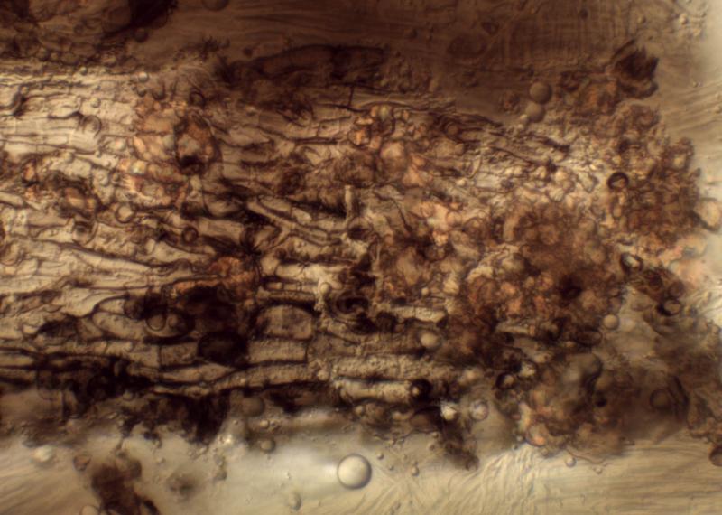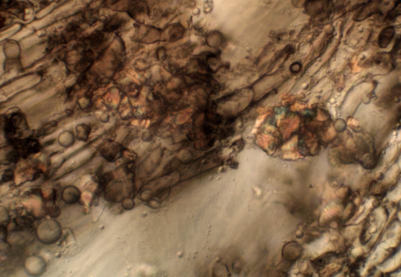 Of particular interest was the presence, in one of the large apothecia from a petiole, of obvious crystals in the blackened stem-base - mostly small, but the large conglomerated one in the final photograph measured 20µm at its widest dimension. In the description of Hy. aesculi the absence of crystals is stressed, so they perhaps should be viewed as extremely rare.
