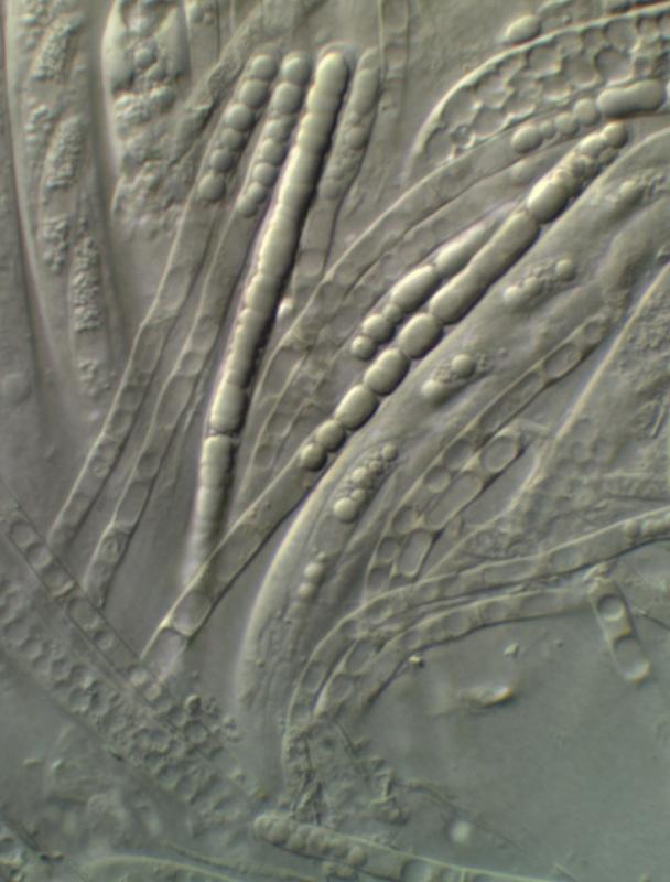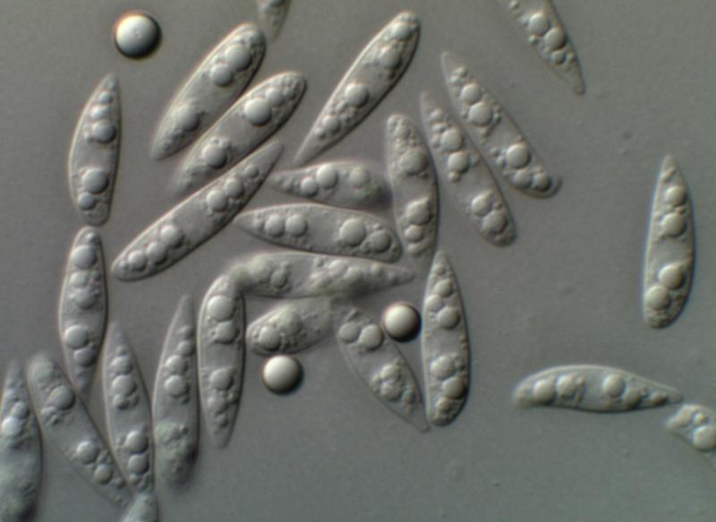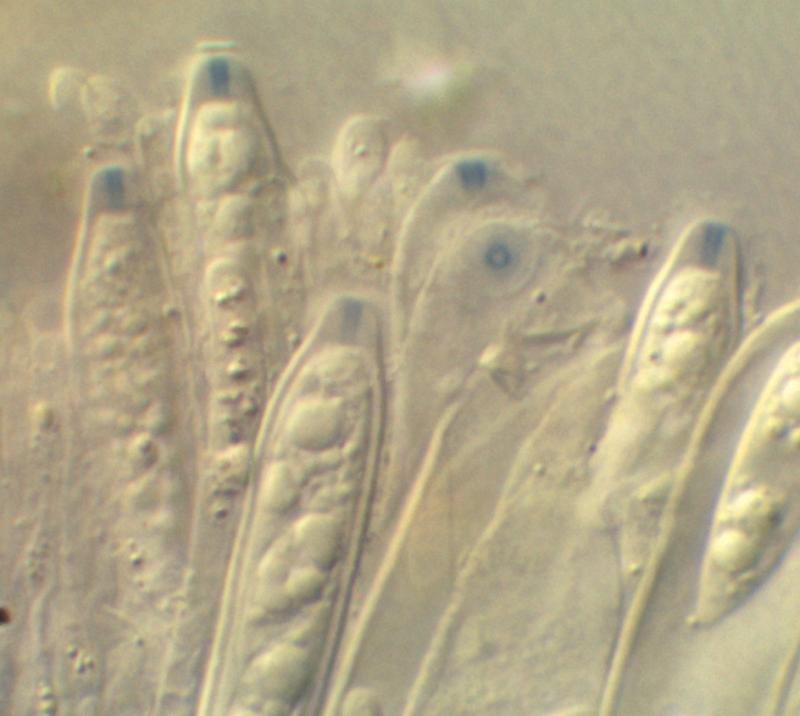 What can be seen is the characteristically-shaped spores commented upon by Zotto in the previous thread - in one case (image included) the spores were seen to have formed an elegant spiral within the ascus. Asci have typical Hymenoscyphus-like IKI+ apical apparatuses and no croziers. The paraphyses in this collection showed well the VBs in various stages of development.
