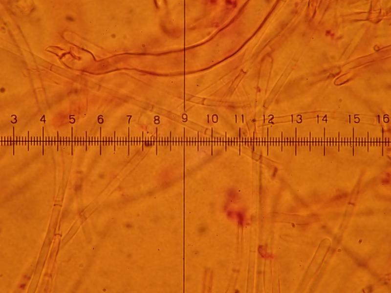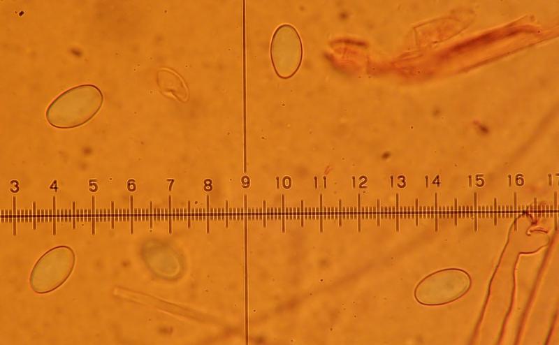 Spores hyalines, sans guttules (immatures? Mais j'ai fait 4-5 préparations et c'est toujours pareil), 13,1-15,8x7,8-9,6 um Q=1,5-1,8 et N=30