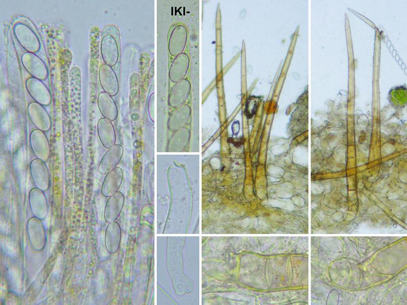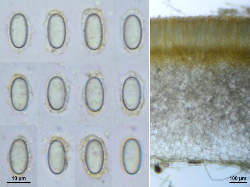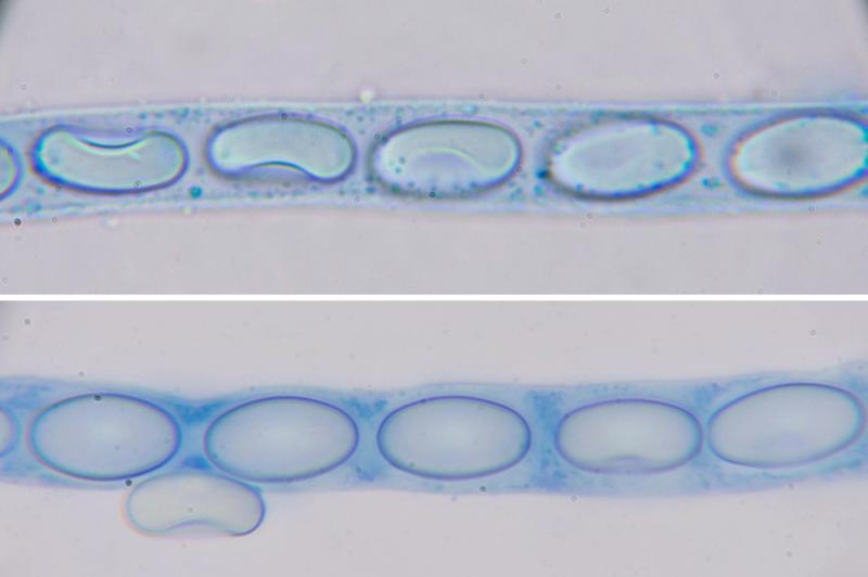 Ascospores in water (on photo): (12.5) 13.7 - 15.1 (15.6) × (7) 7.3 - 8.2 (8.5) µm N = 100 Qe = 1.9
