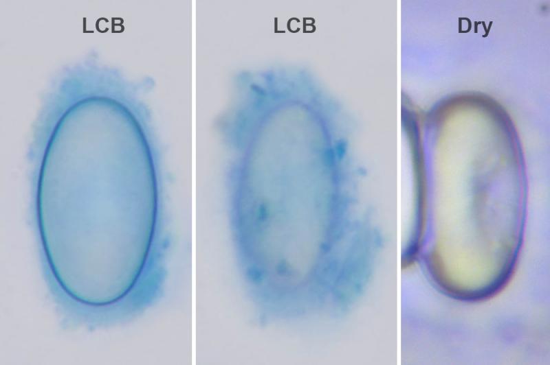 Spores in the water (out of asci) have an additional shell, which is destroyed in most spores. Therefore, it hasn't yet been possible to photograph the ascospores in lactophenol with preservation of this shell.
