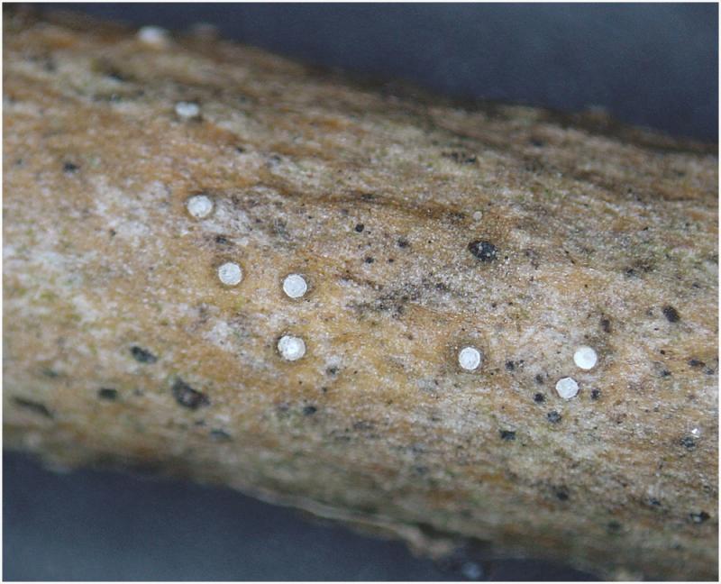 He recogido este ascomiceto creciendo sobre una pequeña rama de planifolio desconocido.