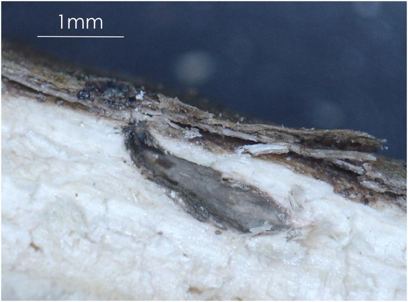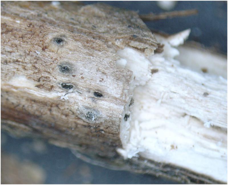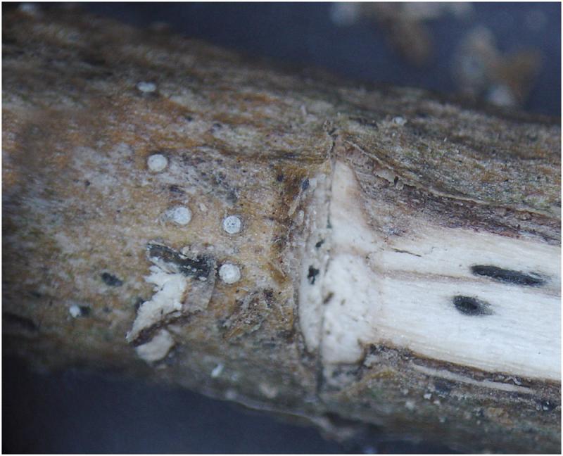 Los peritecios estan inmersos, son alargados y con la papila lateral que se abre a la superficie. En la superficie presenta un "clipeo" blanquecino.