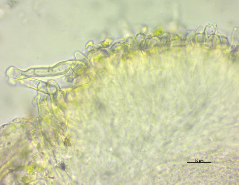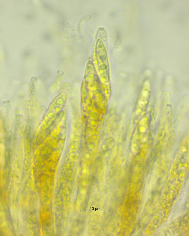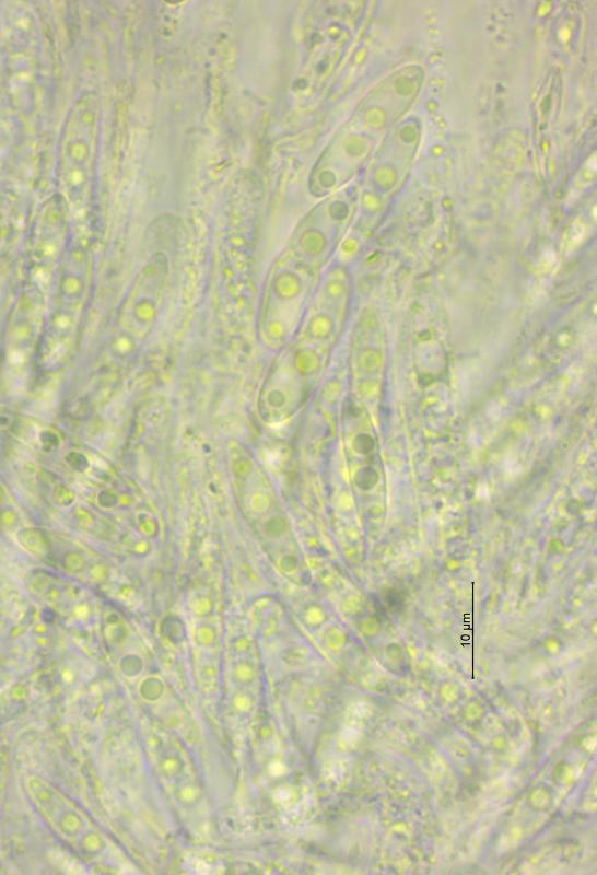 Sur branche morte de Sambucus, apothécies 0.2 mm de diamètre, isolé ou en petits groupes, piriforme, paroi KOH-, asques octosporés, 65 - 75 x 8 - 9 µm, IKI-, spores 14 - 18 x 3.75 - 4.25 µm, hyalines, 1 cloison, finement striées. Merci d'avance pour votre avis.