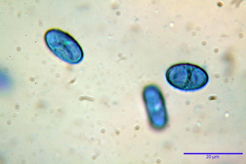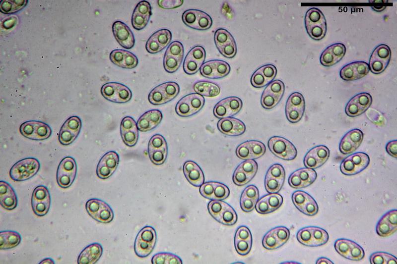 Spore (14,4)15,3-16,2-17,1(17,8) x (8,6)9,1-9,8-10,3(10,7) µm, Q. = (1,5)1,6-1,7-1,7(1,8) biguttulate, da lisce a finemente rugulose a 1000 ingrandimenti in blu cotone lattico a caldo.