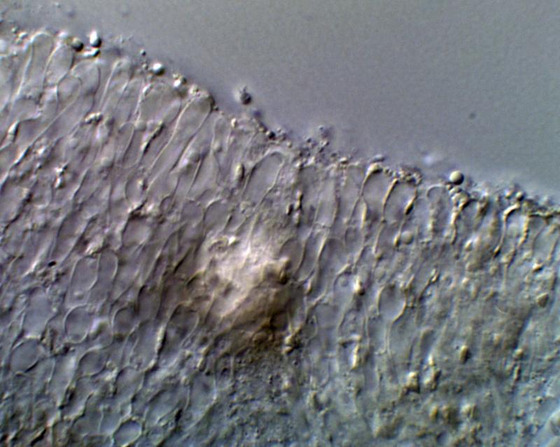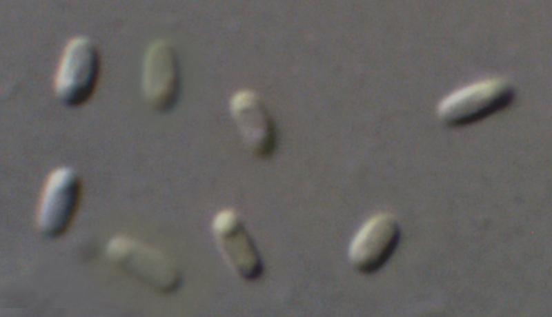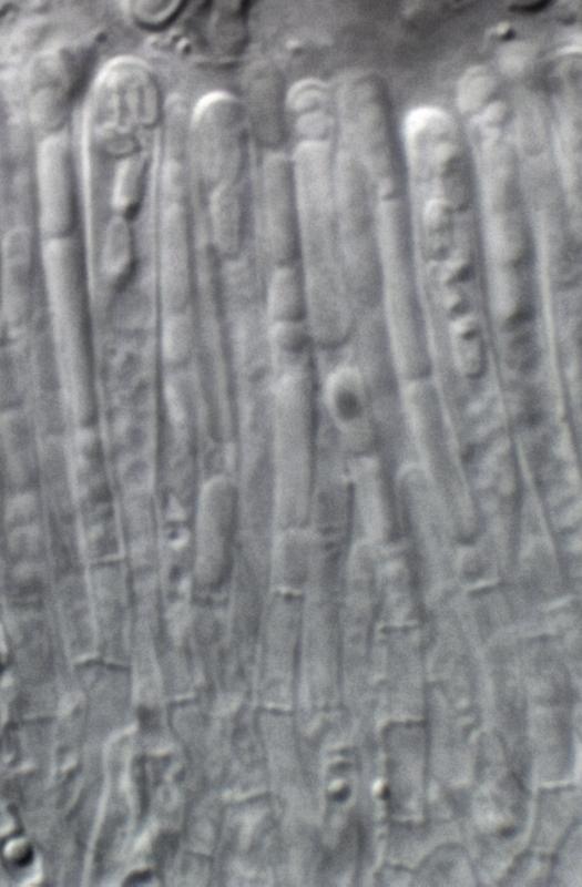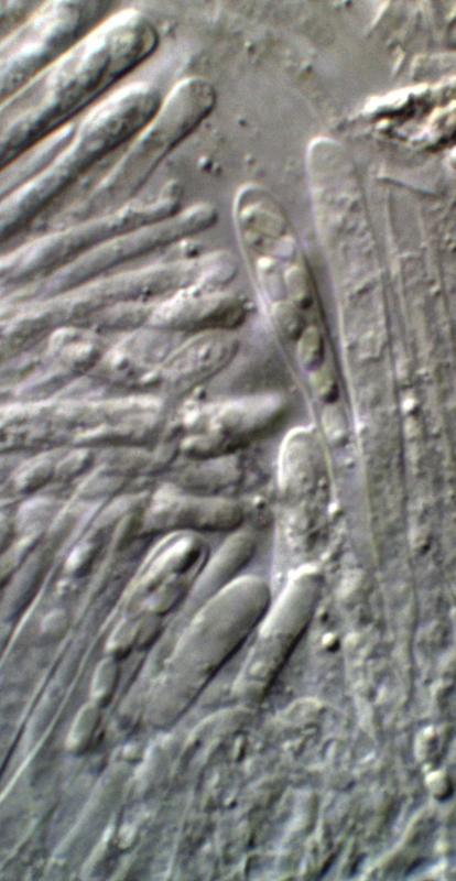 There was, in addition, a different Orbilia species, which had small cylindrical spores and I was sure I had never seen it before. Reference to the monograph led me to Orbilia dryadum, my one doubt was the colour of the apothecia. Two apothecia were checked and, based on the identical spores were clearly the same species, but one had clavate to sub-capitate paraphyses, while the other had (mostly) more typical capitate ones. The spores measured 3.1-3.6 x 1.1-1.4 (1.6)µm - Qe=2.9. Annoyingly, I did not photograph some fusoid/ellipsoid spores (probably conidia) which were present in the slide preparation as I thought they were a contaminant! I should have known better and will make an attempt to find more, though the material is sparse.