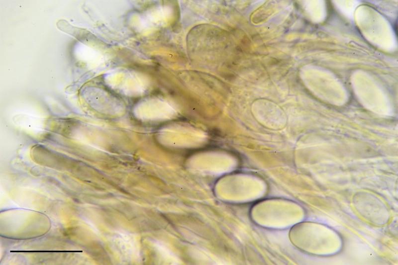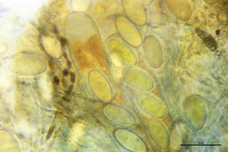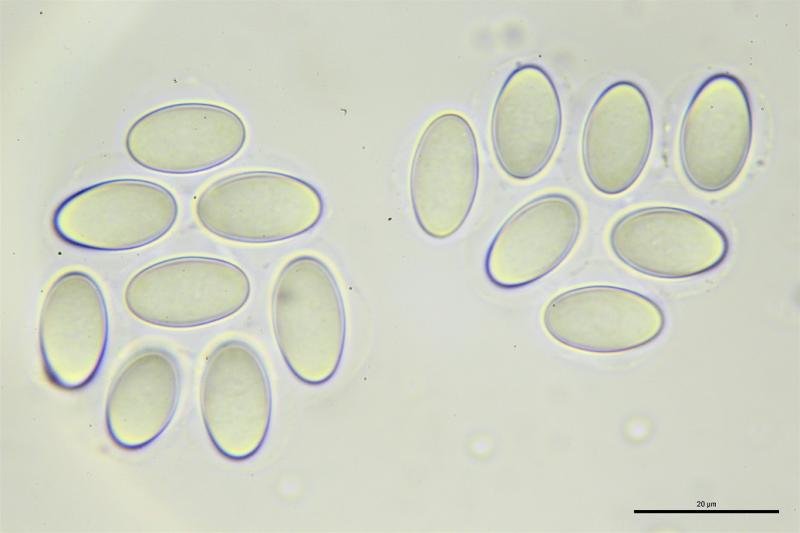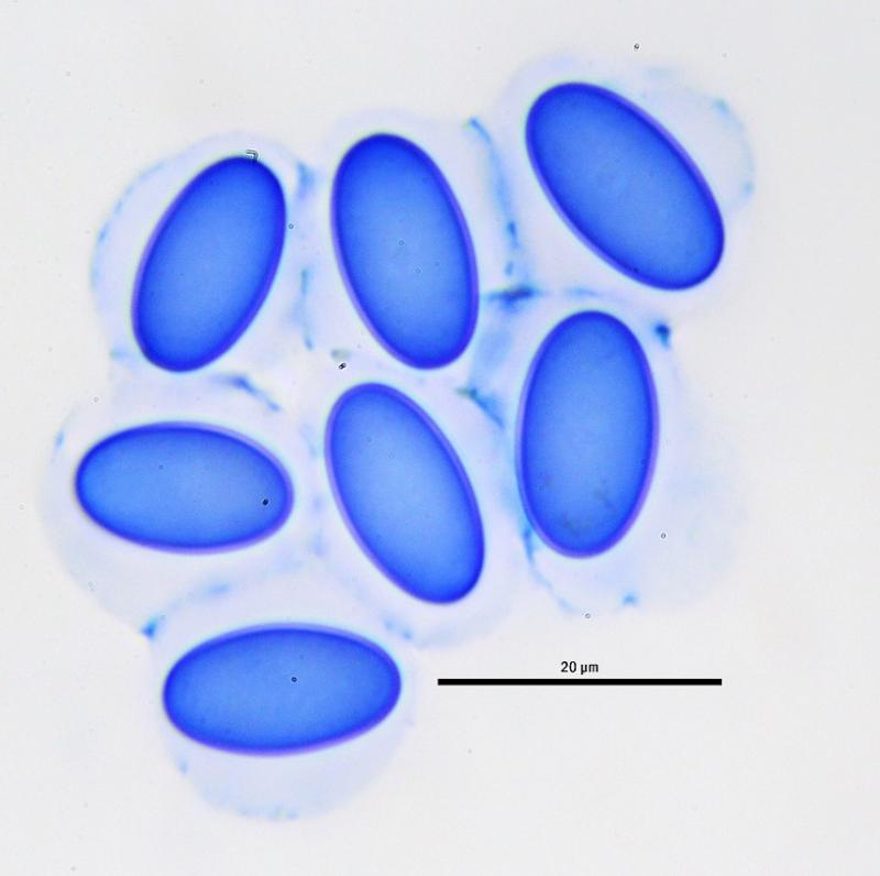Esporas elipsoidales, lisas en CB, con una vaina gelatinosa con pequeñas secreciones.