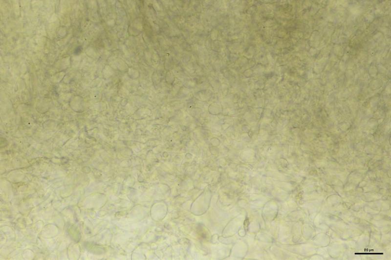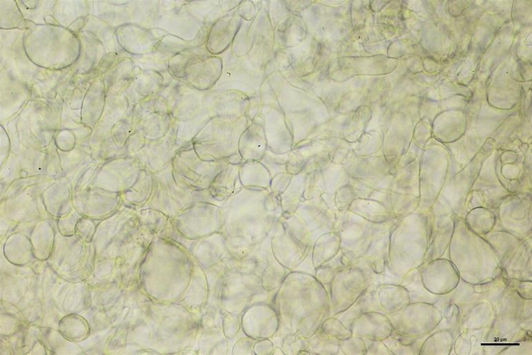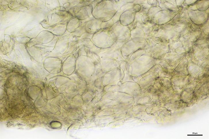 Excípulo medular y E. ectal de textura con células globosas a subglobosas, mezcladas con celulas vesiculosas.