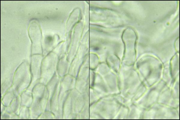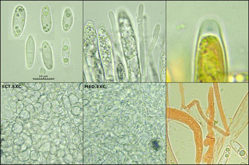 Asci with croziers, IKI+. Ectal excipulum of textura globosa, medulla of textura intricata. Paraphyses without VBs. The spores measure 11.1 - 15.1 × 3.8 - 5.8 µm.