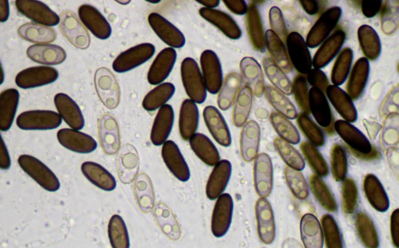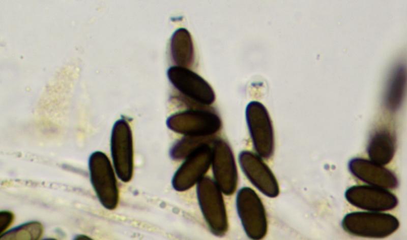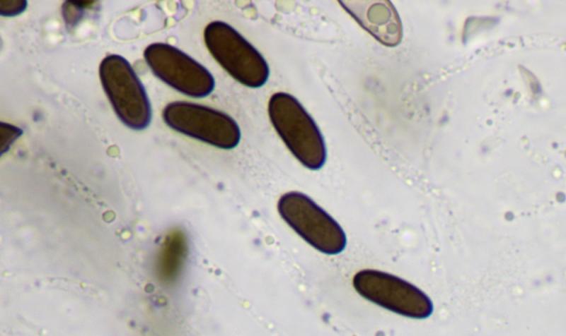 Ascospores : 10-11,5 x 3,5-4,5 µm, cylindriques, brunes, avec une fente germinative, brunes, lisses.