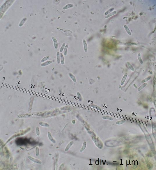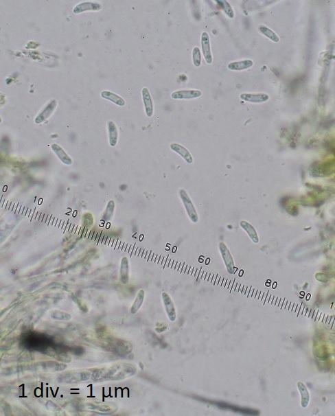 Spore sizes: (6.4)6.7-8.4(9.3) x (1.7)1.9-2.4(2.5) µm Me: 7.6 x 2.2 µm N = 20