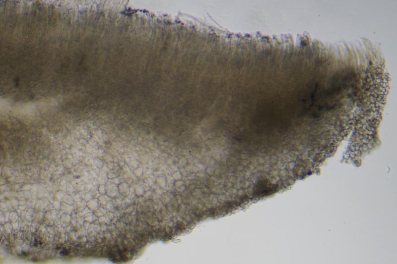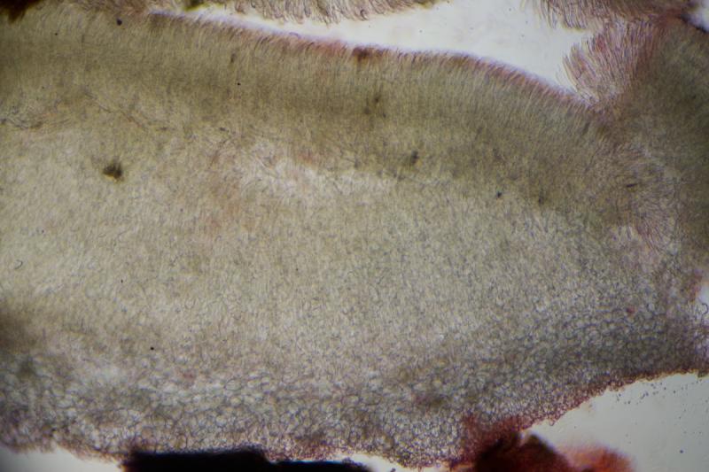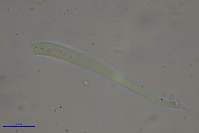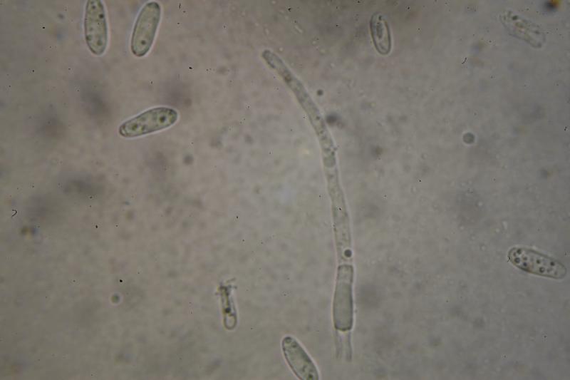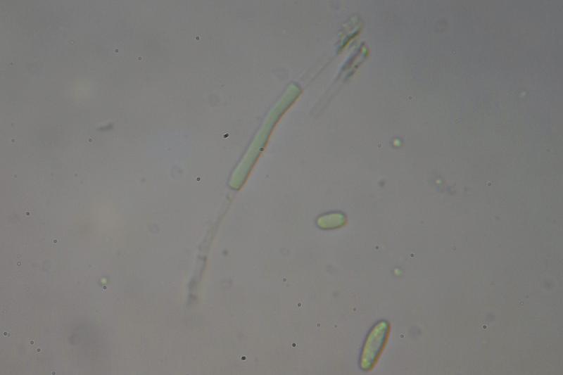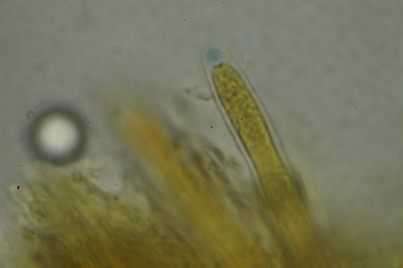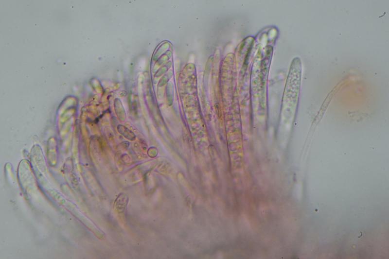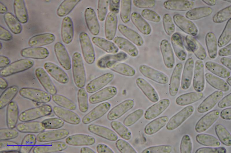 Asci with croziers, Melzer+. Spores are biseriate, cylindrical-ellipsoid with one end wider often, smooth, with some small LBs concentrated around poles. Me= 12.9 × 4.9 µm, Qe= 2.6, N= 30, the length of the spores is pretty variable. Paraphyses with large VBs, which are lost in KOH.