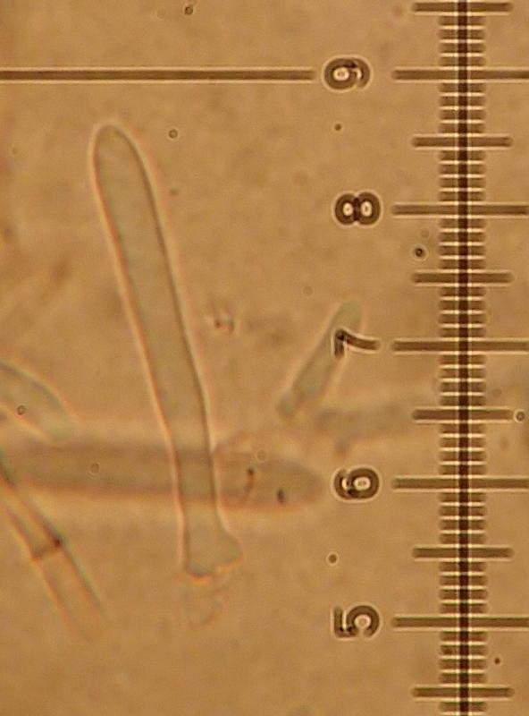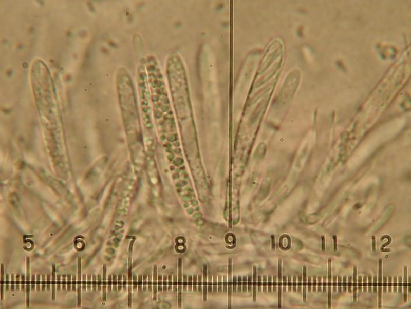 Paraphyses lanceolate, 0-10 protruding, 45x5 µm.