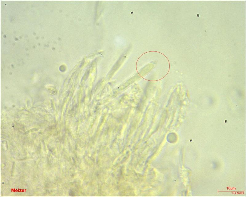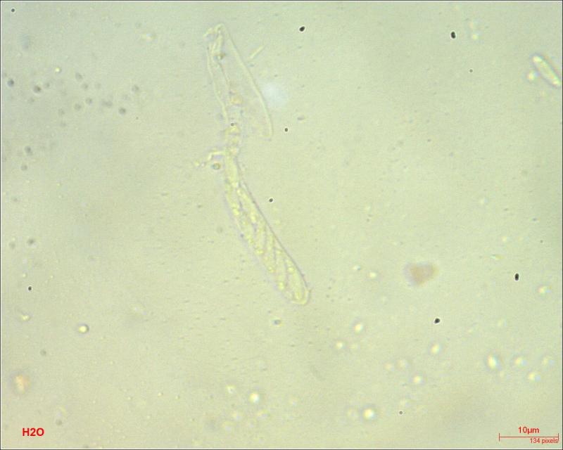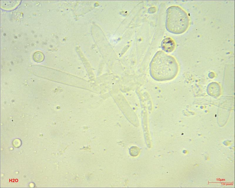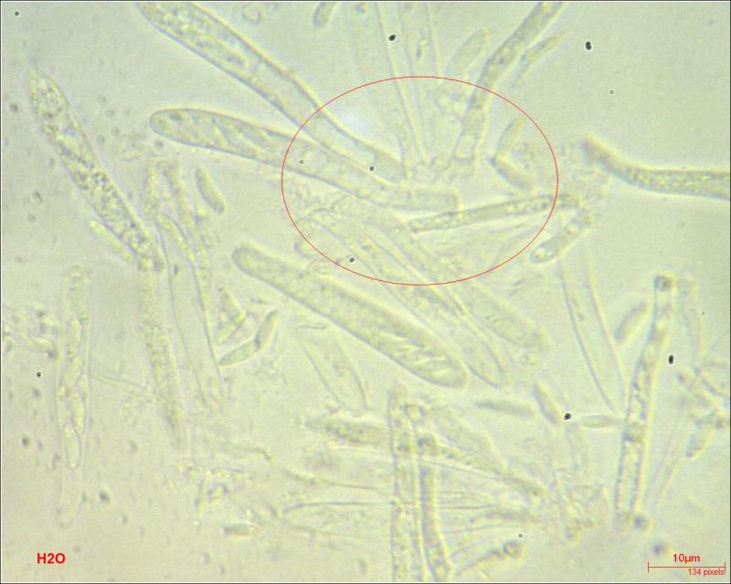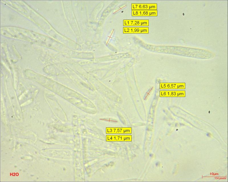 Spores with 1 to more oil droplets at the poles; Av (7.58-) 6.67 (-5.09) x (2.16-) 1.83 (-1.66) µm