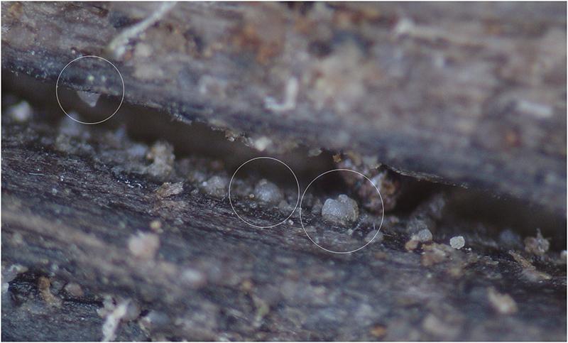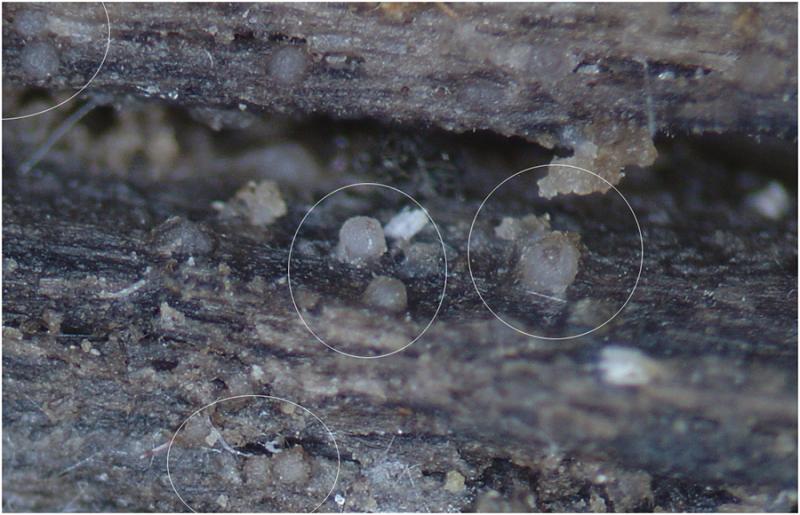 He recogido estos peritecios en una rama de planifolio que estaba en el cauce de una regata. Son globoso a piriformes, de color blanquecino. El tamaño, de 200-250um de diámetro. Son superficiales, aunque con la base algo inmersa en el sustrato. Crecen en grupos, pero dispersos, no agregados.