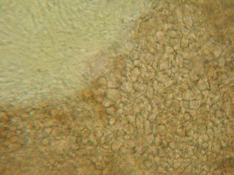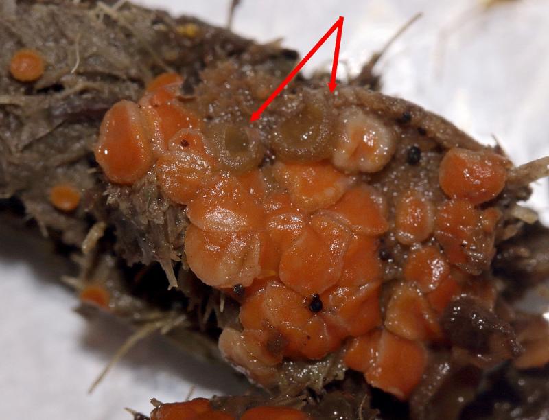 en fait juste à côté des apothécies oranges il y en avait 2 brune verdâtre de m^me taille à face externe un peu granuleuse.. la micro est totalment différentes avec notament des paraphyses granuleuse, cloisonnées fines, les spores en ballon de rugby, pas de réaction desd asques dans le melzer